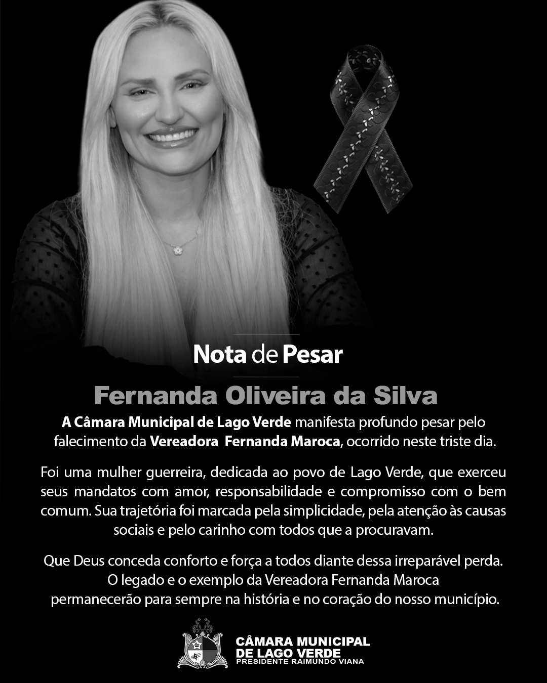 Fernanda exerceu seu mandato com dedicação, compromisso e respeito ao povo de Lago Verde, deixando um legado de trabalho e amor por nossa cidade. Sua partida representa uma perda irreparável para o Legislativo Municipal e para toda a comunidade.